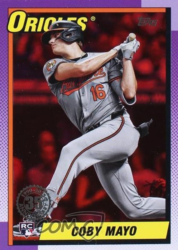The Coby Mayo 2025 Topps #T90-93 1990 Topps Baseball - Red /5 Rookie card in Raw condition has not changed in price in the last 30 days and was last sold for $16.50 .