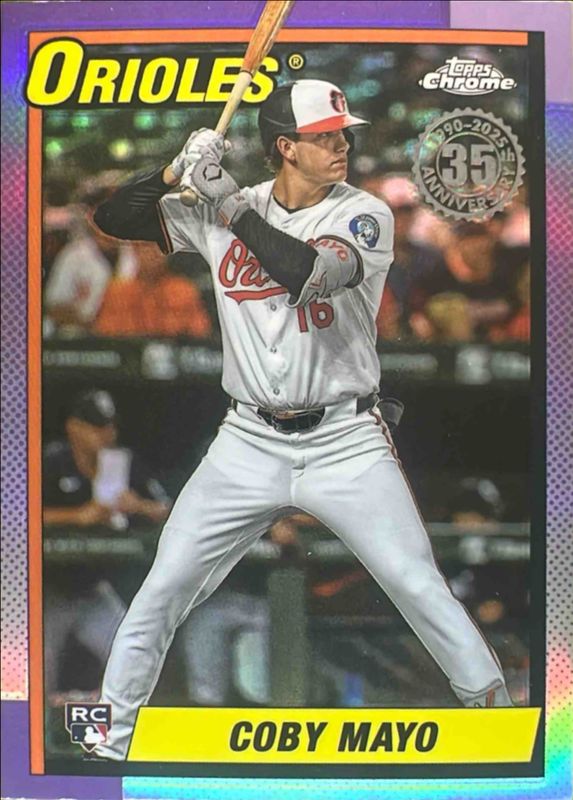The Coby Mayo 2025 Topps Chrome #90CB-17 1990 Baseball Rookie card is 1 of 153 Coby Mayo's card variations in the 2025 Topps Chrome set being tracked by Sports Card Investor, including Base, Geometric Refractor, Lightboard Logo Variation, Negative Refractor, and Prism Refractor.