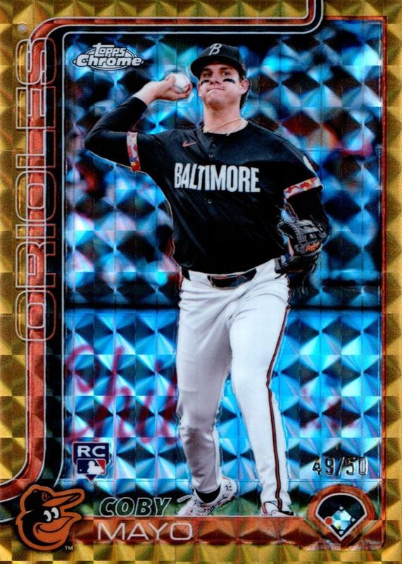 The Coby Mayo 2025 Topps Chrome #120 Gold Geometric Refractor /50 Rookie card in Raw condition has not changed in price in the last 30 days and was last sold for $10.50 .