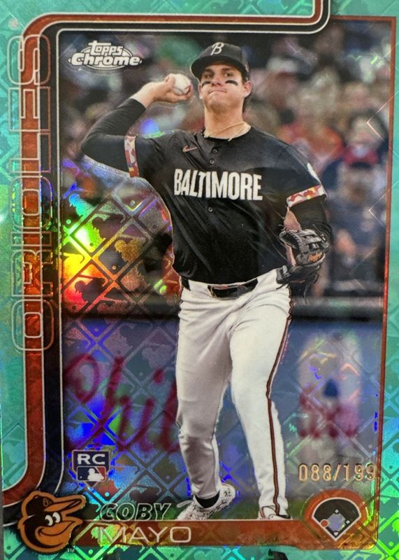 The Coby Mayo 2025 Topps Chrome Logofractor Edition #120 Aqua Refractor /199 Rookie card in Raw condition has moved up $3.00 (+240%) in the last 30 days and was last sold for $4.25 .