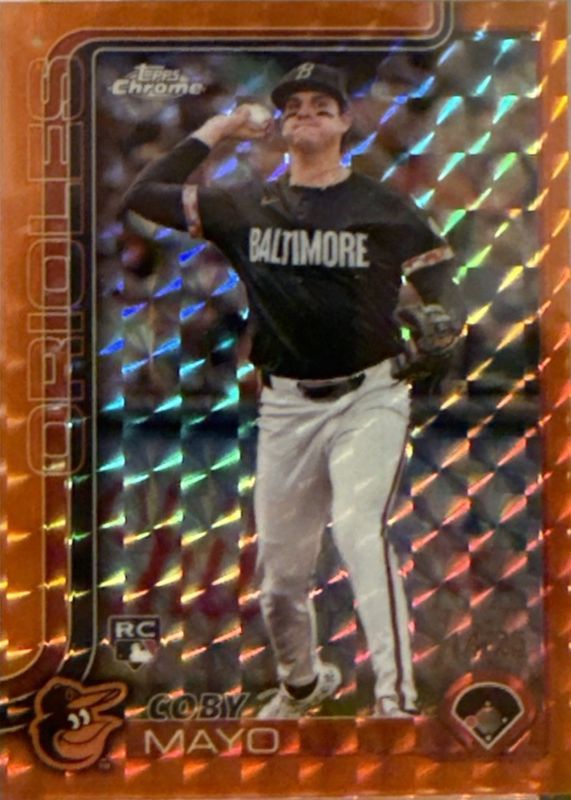 The Coby Mayo 2025 Topps Chrome #120 Orange Geometric Refractor /25 Rookie card in Raw condition has not changed in price in the last 30 days.
