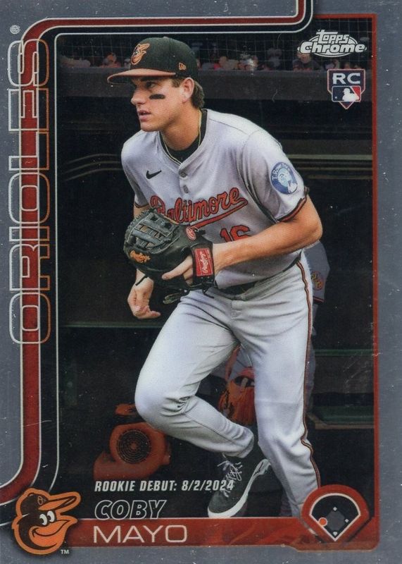 The Coby Mayo 2025 Topps Chrome Update #USC94 Rookie Debut card in Raw condition has moved down -$1.00 (-50.0%) in the last 30 days and was last sold for $1.00 .