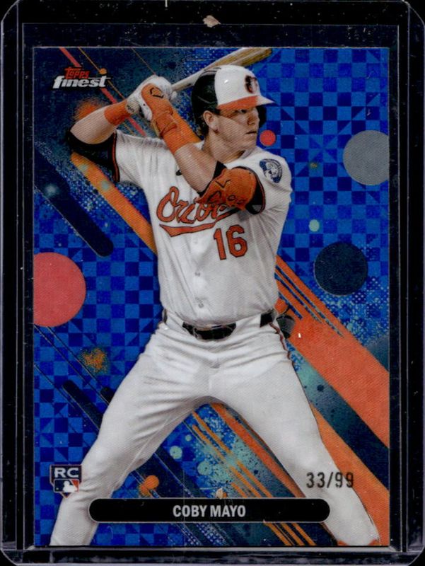The Coby Mayo 2025 Topps Finest #26 Base Common - Blue X-Fractor /99 Rookie card is 1 of 161 Coby Mayo's card variations in the 2025 Topps Finest set being tracked by Sports Card Investor, including Common, Rare, Uncommon, Common - Checkerboard Refractor, and Common - Refractor.
