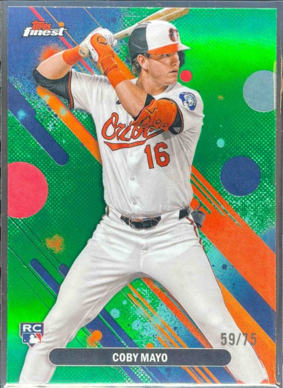 The Coby Mayo 2025 Topps Finest #26 Base Common - Green Refractor /75 Rookie card is 1 of 161 Coby Mayo's card variations in the 2025 Topps Finest set being tracked by Sports Card Investor, including Common, Rare, Uncommon, Common - Checkerboard Refractor, and Common - Refractor.
