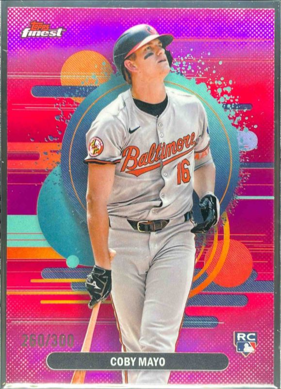 The Coby Mayo 2025 Topps Finest #188 Base Uncommon - Magenta Refractor /300 Rookie card is 1 of 161 Coby Mayo's card variations in the 2025 Topps Finest set being tracked by Sports Card Investor, including Common, Rare, Uncommon, Common - Checkerboard Refractor, and Common - Refractor.