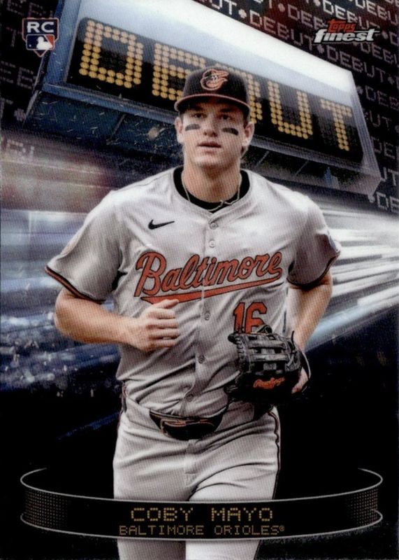 The Coby Mayo 2025 Topps Finest #D-4 Debut Rookie card is 1 of 161 Coby Mayo's card variations in the 2025 Topps Finest set being tracked by Sports Card Investor, including Common, Rare, Uncommon, Common - Checkerboard Refractor, and Common - Refractor.