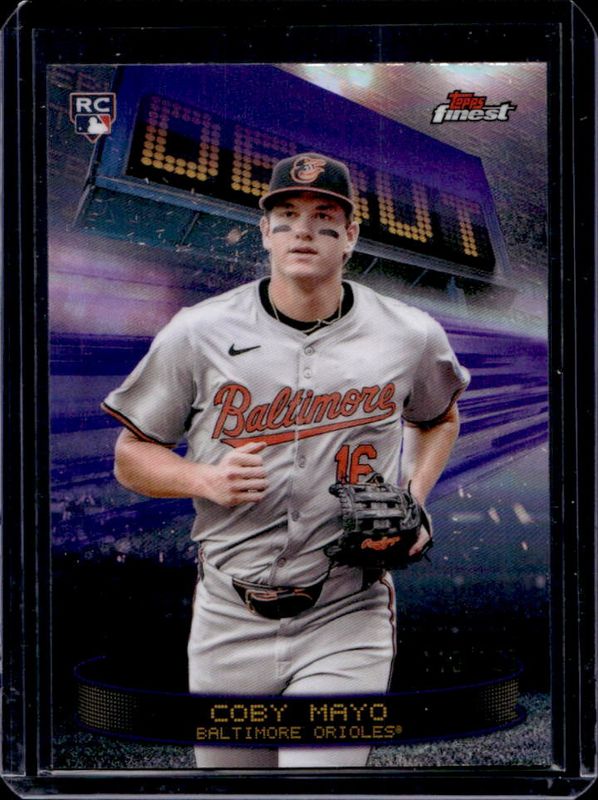 The Coby Mayo 2025 Topps Finest #D-4 Debut - Purple Refractor /125 Rookie card is 1 of 161 Coby Mayo's card variations in the 2025 Topps Finest set being tracked by Sports Card Investor, including Common, Rare, Uncommon, Common - Checkerboard Refractor, and Common - Refractor.
