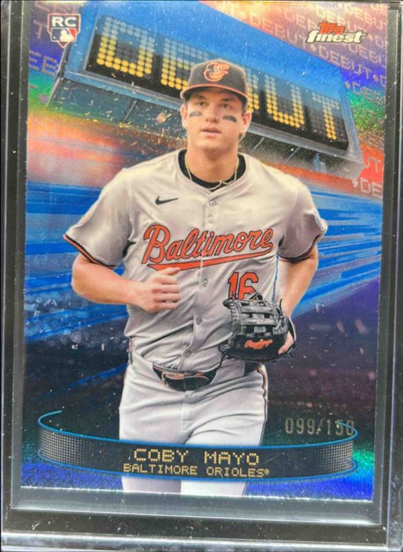 The Coby Mayo 2025 Topps Finest #D-4 Debut - Sky Blue Refractor /150 Rookie card is 1 of 161 Coby Mayo's card variations in the 2025 Topps Finest set being tracked by Sports Card Investor, including Common, Rare, Uncommon, Common - Checkerboard Refractor, and Common - Refractor.