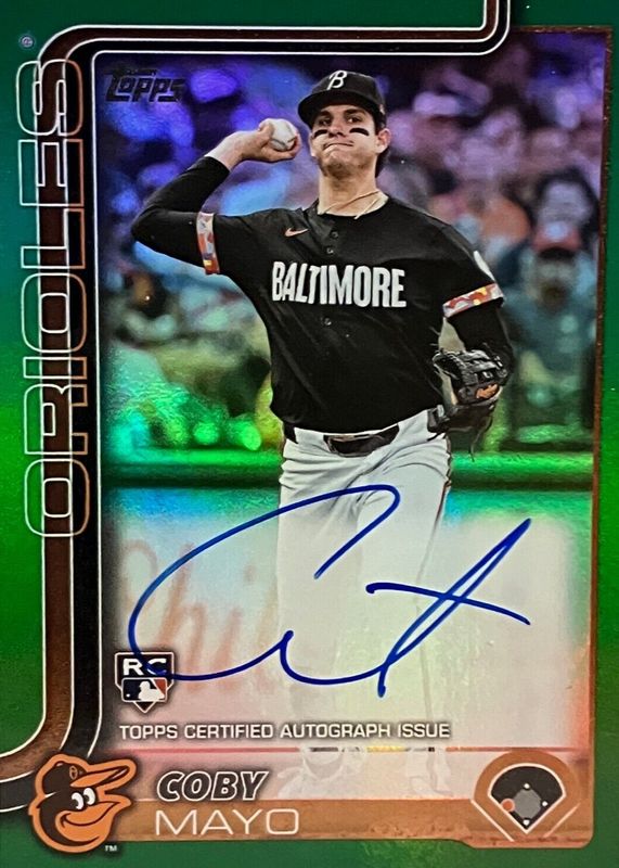 The Coby Mayo 2025 Topps #20 Flagship Real One Autographs - Green Foil /99 Rookie card in Raw condition has not changed in price in the last 30 days and was last sold for $31.00 .