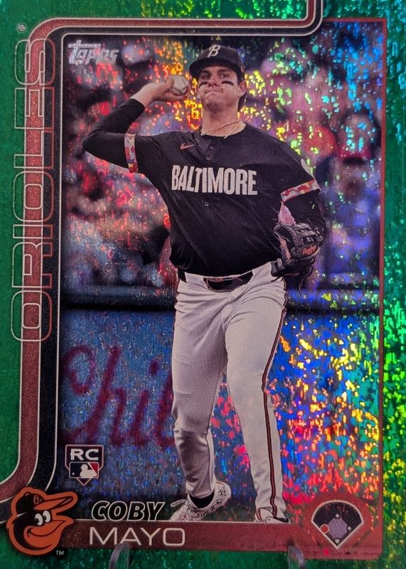 The Coby Mayo 2025 Topps #20 Green Holo Foil /99 Rookie card in Raw condition has not changed in price in the last 30 days and was last sold for $25.00 .