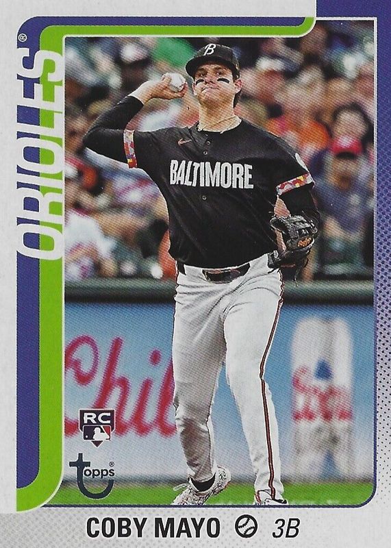 This card is 1 of 234 Coby Mayo's card variations in the 2025 Topps set being tracked by Sports Card Investor, including Base, Aqua Holo Foil, Aqua Rainbow, Diamante Foil, and Eggs.