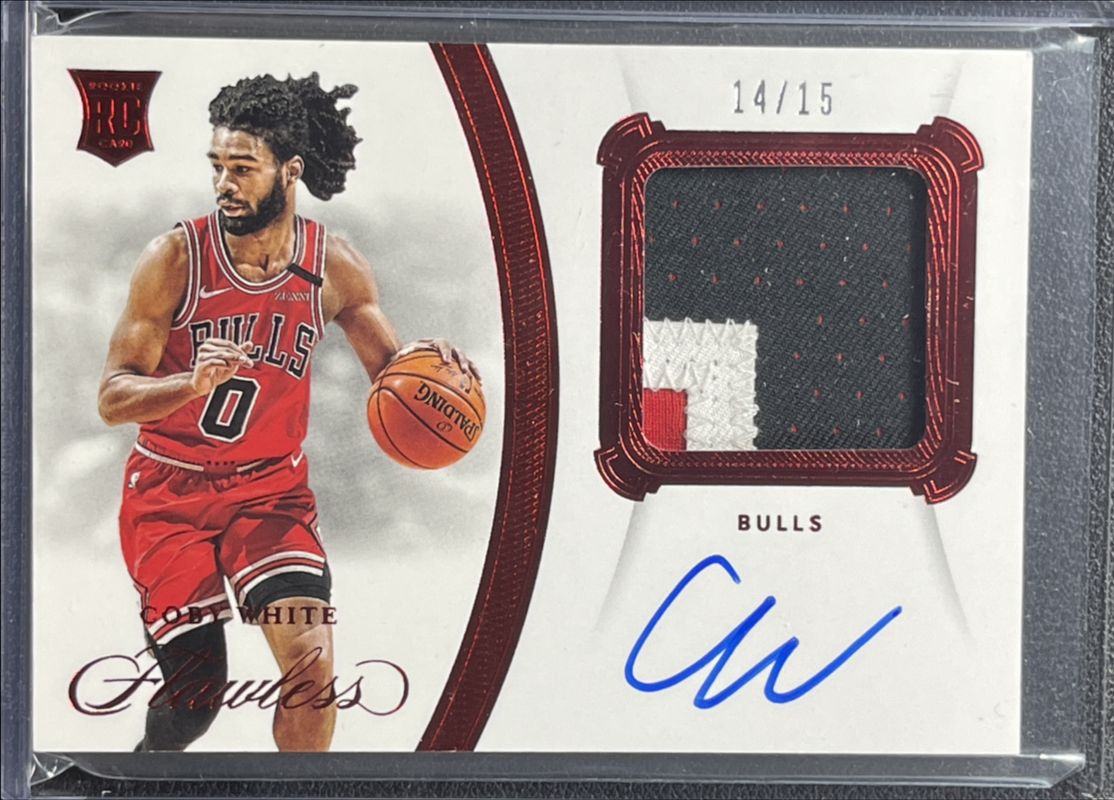 The Coby White 2019 Flawless #PA-CBW Flawless Patch Autographs - Ruby /15 Rookie card is 1 of 41 Coby White's card variations in the 2019 Flawless set being tracked by Sports Card Investor, including Base /5, Gold /10, Emerald /5, Bronze FOTL /3, and Platinum /1.