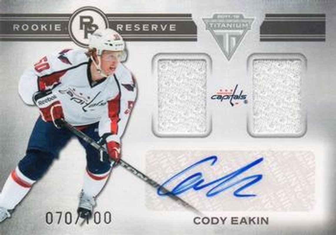 The Cody Eakin 2011 Titanium #24 Rookie Reserve Dual Memorabilia Autographs /100 card is 1 of 10 Cody Eakin's card variations in the 2011 Titanium set being tracked by Sports Card Investor, including Base /93, Spectrum Gold /6, Printing Plates Black /1, Printing Plates Cyan /1, and Printing Plates Magenta /1.