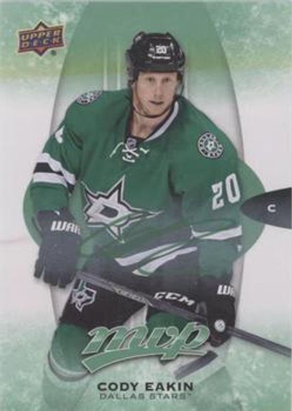 The Cody Eakin 2016 Upper Deck MVP #5 Green Script card is 1 of 11 Cody Eakin's card variations in the 2016 Upper Deck MVP set being tracked by Sports Card Investor, including Base, Colors & Contours, Puzzle Back, Silver Script, and Gold Script /135.