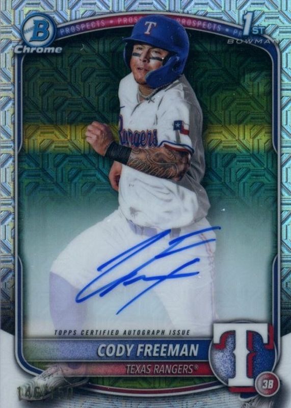 Best Prices Available For Sale of Cody Freeman 2025 Bowman #CPA-CFR Chrome Prospect Auto - HTA Choice Refractor /150 (1st)