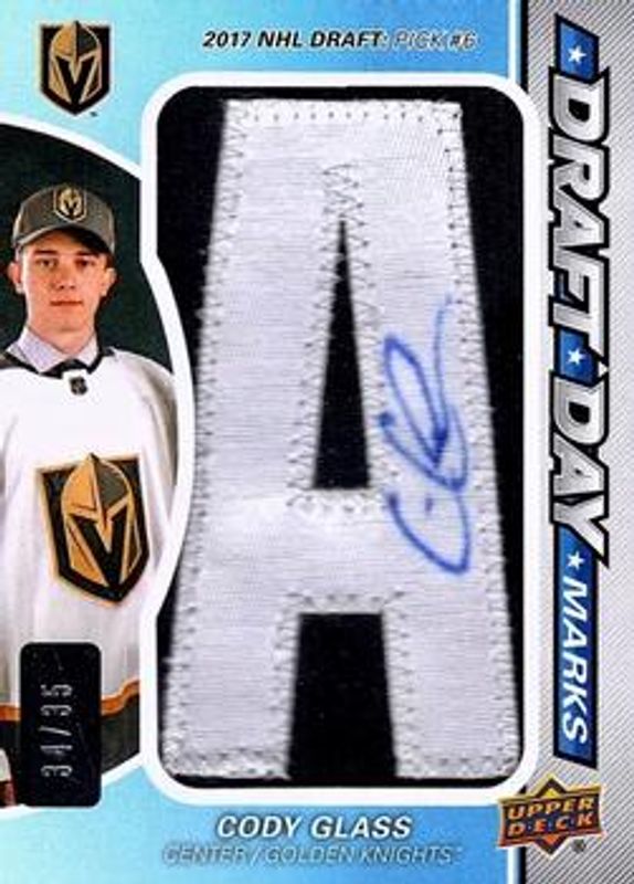 The Cody Glass 2019 SP Game Used #DDM-GL Draft Day Marks Rookies /35 card is 1 of 24 Cody Glass' card variations in the 2019 SP Game Used set being tracked by Sports Card Investor, including Base /24, Rainbow /201, Orange Rainbow /119, Black Rainbow /5, and Green Storm /1.