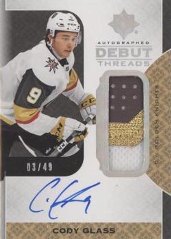 The Cody Glass 2019 Upper Deck Ultimate Collection #DT-CG Autographed Debut Threads /99 Rookie card is 1 of 16 Cody Glass' card variations in the 2019 Upper Deck Ultimate Collection set being tracked by Sports Card Investor, including Base /299, Quest Challenge Achievement VIP Rookies, Signatures Masterpieces, Ultimate Introductions, and Ultimate Introductions Gold Autographs.