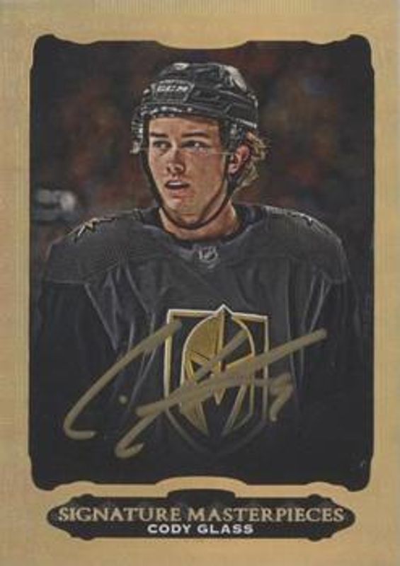 The Cody Glass 2019 Upper Deck Ultimate Collection #USM-CG Signatures Masterpieces Rookie card is 1 of 16 Cody Glass' card variations in the 2019 Upper Deck Ultimate Collection set being tracked by Sports Card Investor, including Base /299, Quest Challenge Achievement VIP Rookies, Ultimate Introductions, Ultimate Introductions Gold Autographs, and Ultimate Rookies Jersey /399.