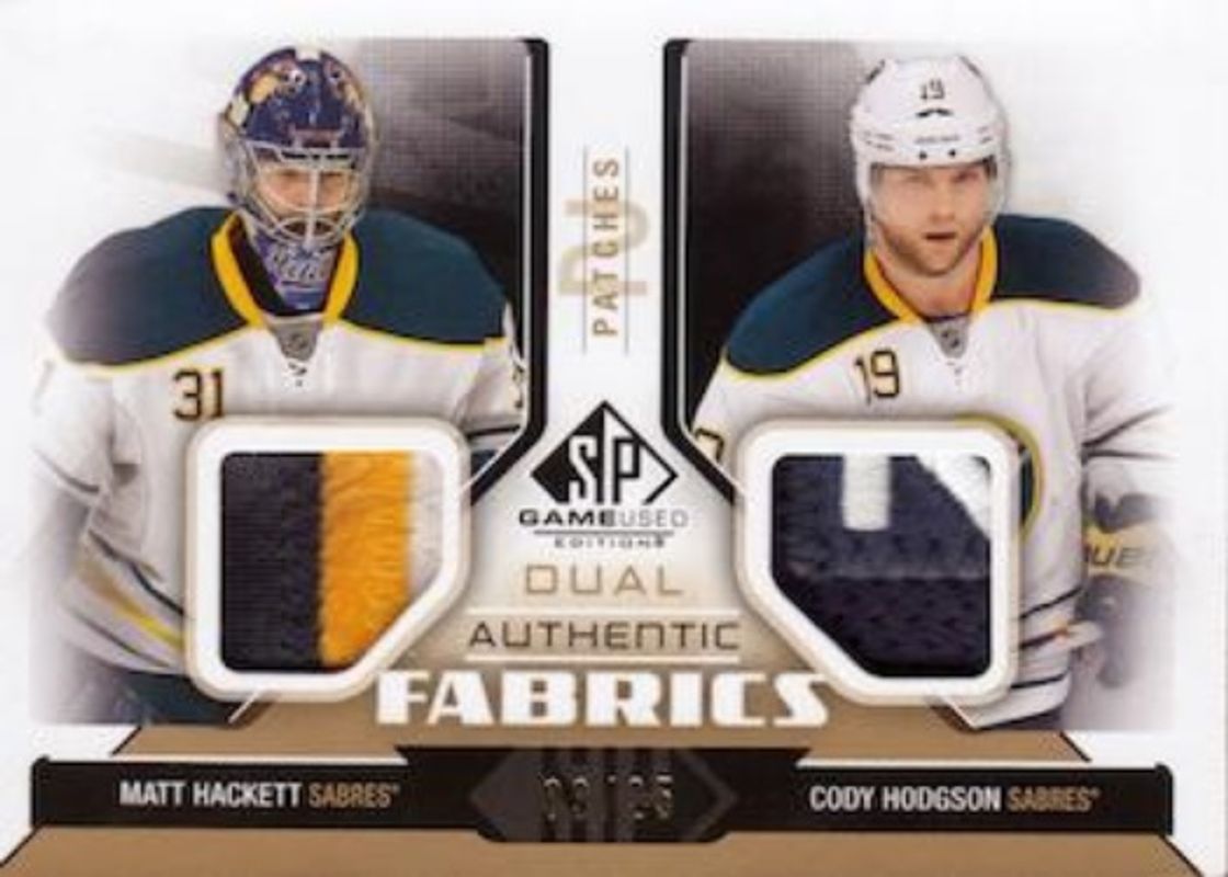 The Cody Hodgson / Matt Hackett 2014 SP Game Used #AF2-HH Authentic Fabrics Dual Patches /25 card is 1 of 2 Cody Hodgson / Matt Hackett's card variations in the 2014 SP Game Used set being tracked by Sports Card Investor, including Authentic Fabrics Dual.