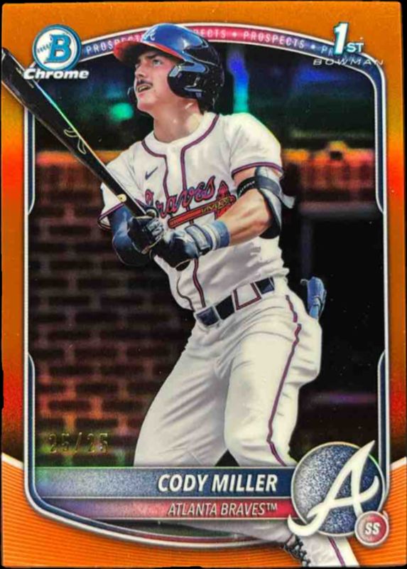 The Cody Miller 2025 Bowman Draft #BDC-91 Chrome - Orange Refractor /25 card is 1 of 85 Cody Miller's card variations in the 2025 Bowman Draft set being tracked by Sports Card Investor, including Base, Chrome, Chrome - Lazer Refractor, Chrome - Refractor, and Chrome - Sky Blue Refractor.