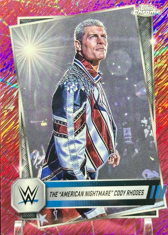 The Cody Rhodes 2025 Topps Chrome WWE #1 Pink Shimmer Refractor card in Raw condition has moved up $4.00 (+404%) in the last 30 days and was last sold for $4.99 .