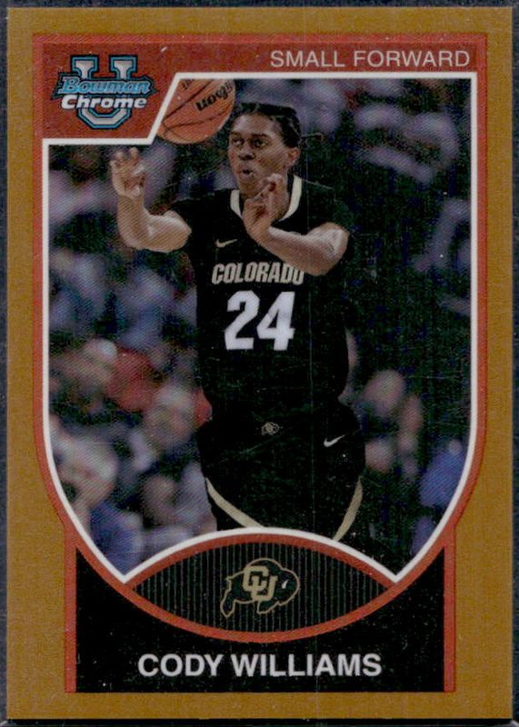 The Cody Williams 2023 Bowman Chrome University #07B-19 2007-08 Bowman - Gold Refractor /50 card is 1 of 71 Cody Williams' card variations in the 2023 Bowman Chrome University set being tracked by Sports Card Investor, including #16 Base, #16b Base, #16 Pink Refractor, #16 Purple Shimmer Refractor, and #16 Refractor.