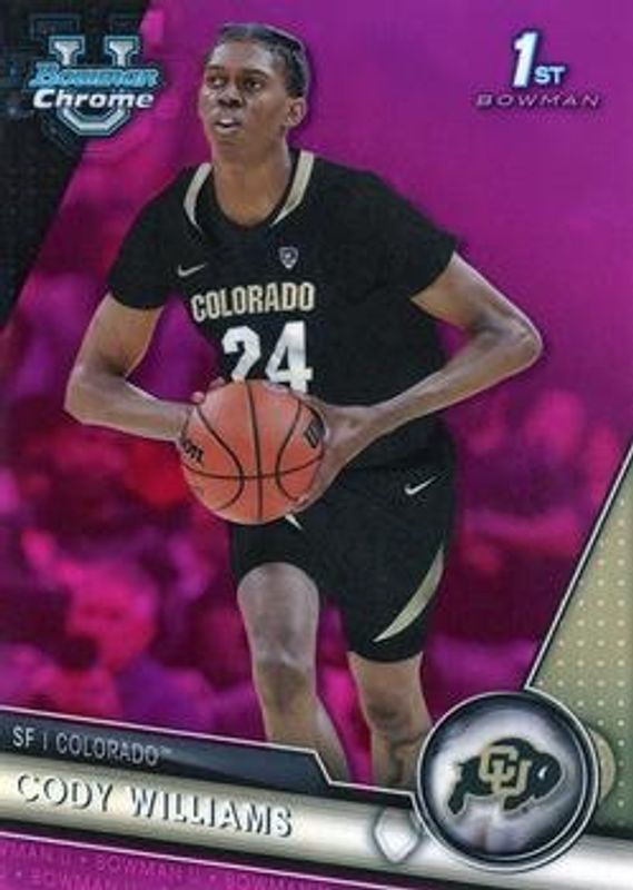The Cody Williams 2023 Bowman Chrome University #16 Pink Refractor card is 1 of 71 Cody Williams' card variations in the 2023 Bowman Chrome University set being tracked by Sports Card Investor, including #16 Base, #16b Base, #16 Purple Shimmer Refractor, #16 Refractor, and #16 X-Fractor.