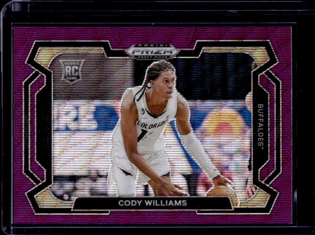The Cody Williams 2024 Prizm Draft Picks #80b Purple Wave Rookie card is 1 of 128 Cody Williams' card variations in the 2024 Prizm Draft Picks set being tracked by Sports Card Investor, including #80b Base, #80 Base, #80b Green, #80 Green, and #80 Green Wave.