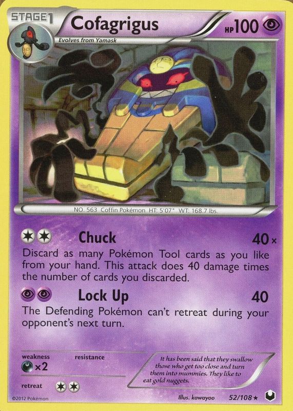 The Cofagrigus 2012 Black & White: Dark Explorers #052/108 Base card in Raw TCG (Lightly Played) condition has not changed in price in the last 30 days and was last sold for $2.00 .