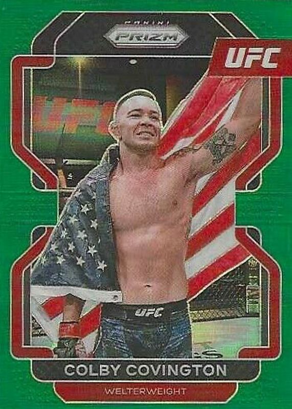 The Colby Covington 2022 Prizm UFC #121 Green card in Raw condition has not changed in price in the last 30 days and was last sold for $3.36 .