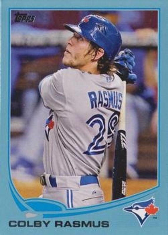 The Colby Rasmus 2013 Topps #68 Blue card is 1 of 42 Colby Rasmus' card variations in the 2013 Topps set being tracked by Sports Card Investor, including #TM-40 1972 Topps Minis, #67 Base, #68 Base, #CHR-CR Chasing History Relics, and #CHR-CR Chasing History Relics - Gold /99.