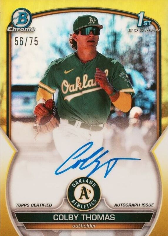 2023 Bowman Chrome Colby Thomas 1st Bowman Yellow Auto /75 Athletics Color Match