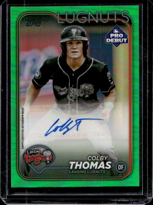 The Colby Thomas 2024 Topps Pro Debut #PD-79 Base Autographs - Green /99 card is 1 of 31 Colby Thomas' card variations in the 2024 Topps Pro Debut set being tracked by Sports Card Investor, including Base, Fuchsia Foil /199, Sparkle Foil /175, Blue Foil /150, and Green Foil /99.