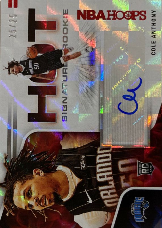 The Cole Anthony 2020 Hoops #HR-CAN Hot Signatures Rookies - Red /25 card in Raw condition has not changed in price in the last 30 days and was last sold for $100.00 .