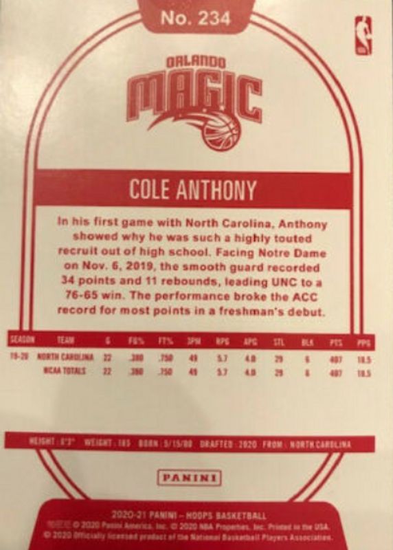 COLE ANTHONY 2020-21 Panini Hoops RED BACK ROOKIE SP RC Magic #234