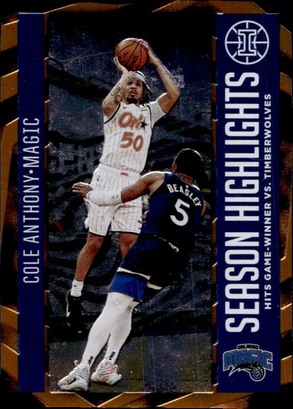 The Cole Anthony 2020 Illusions #2 Season Highlights - Orange /75 Rookie card is 1 of 46 Cole Anthony's card variations in the 2020 Illusions set being tracked by Sports Card Investor, including Base, Asia Trophy Collection Base, Asia Trophy Collection Red, Trophy Collection Bronze, and Trophy Collection Emerald.