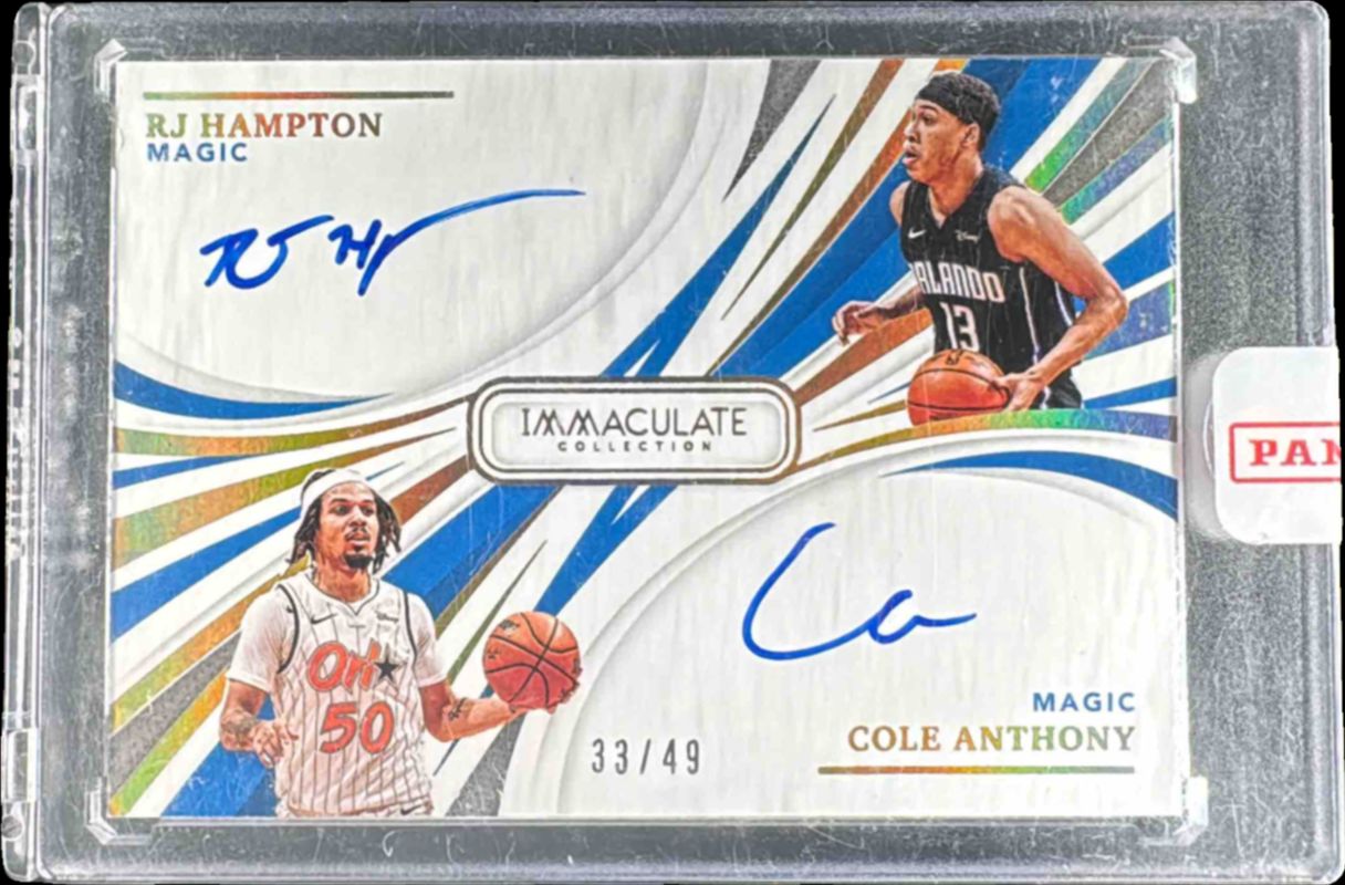The Cole Anthony 2020 Immaculate #DA-RCA Dual Autographs /49 Rookie card is 1 of 41 Cole Anthony's card variations in the 2020 Immaculate set being tracked by Sports Card Investor, including #117 Base /99, #56 Base /99, #56 Red /49, #117 Red /49, and #56 Blue /25.