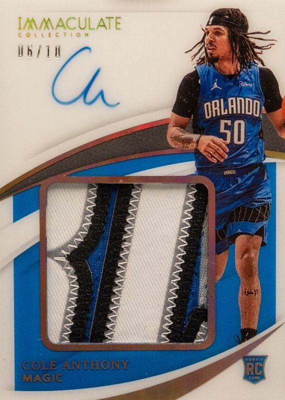 The Cole Anthony 2020 Immaculate #PPA-CAN Premium Patch Autographs - Gold (/10) Rookie card in Raw condition has not changed in price in the last 30 days and was last sold for $112.50 .