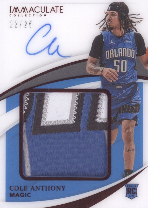 The Cole Anthony 2020 Immaculate #PPA-CAN Premium Patch Autographs - Red (/25) Rookie card in Raw condition has not changed in price in the last 30 days and was last sold for $100.00 .