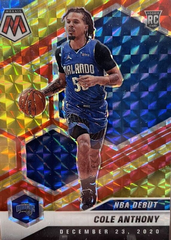 The Cole Anthony 2020 Mosaic #268 NBA Debut - Choice Fusion Red & Yellow /88 Rookie card in Raw condition has not changed in price in the last 30 days and was last sold for $4.99 .