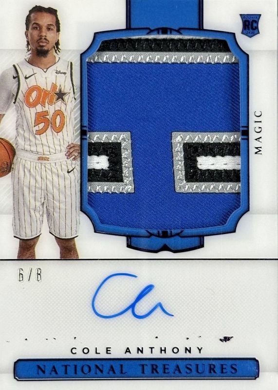 This card is 1 of 9 Cole Anthony's card variations in the 2020 National Treasures set being tracked by Sports Card Investor, including Rookie Patch Auto /99, Rookie Patch Auto - Gold FOTL /24, Rookie Patch Auto - Gold /10, Rookie Patch Auto - Emerald /5, and Rookie Patch Auto - Blue FOTL /3.