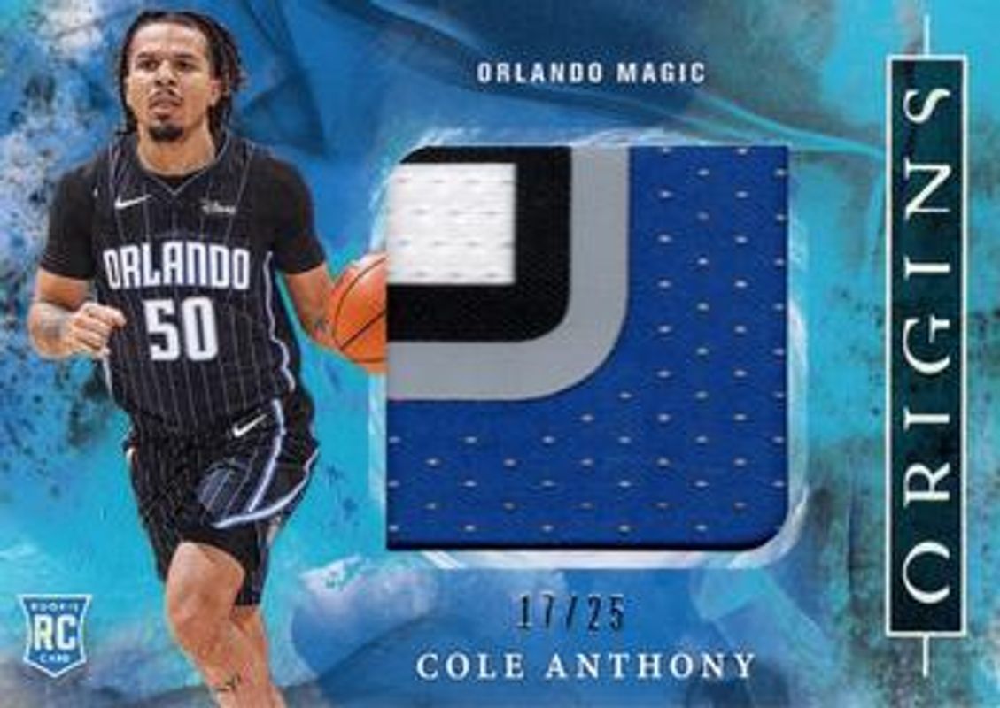 The Cole Anthony 2020 Origins #RJJ-ANT Rookie Jumbo Jerseys - Turquoise /25 card is 1 of 39 Cole Anthony's card variations in the 2020 Origins set being tracked by Sports Card Investor, including Base, Red, Blue /99, Orange /75, and Pink /60.