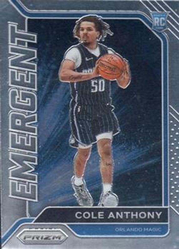 The Cole Anthony 2020 Prizm #21 Emergent Rookie card is 1 of 76 Cole Anthony's card variations in the 2020 Prizm set being tracked by Sports Card Investor, including Base, Choice Blue Yellow Green, Fast Break, Green, and Green Ice.