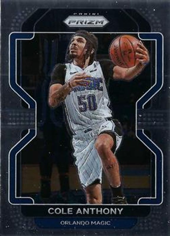 The Cole Anthony 2021 Prizm #121 Base card is 1 of 60 Cole Anthony's card variations in the 2021 Prizm set being tracked by Sports Card Investor, including Blue NBA 75th Anniversary, Blue Wave, Choice Blue Yellow Green, Factory Set Blue Hyper, and Factory Set Green Hyper.