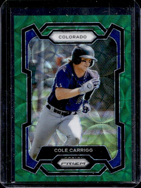 The Cole Carrigg 2024 Prizm #198 Green Scope /75 card is 1 of 30 Cole Carrigg's card variations in the 2024 Prizm set being tracked by Sports Card Investor, including Base, Blue Ice, Green, Green Ice, and Pink Ice.