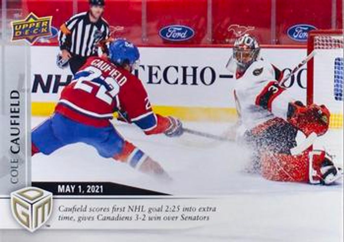 The Cole Caufield 2020 Upper Deck Game Dated Moments #48 Base card is 1 of 4 Cole Caufield's card variations in the 2020 Upper Deck Game Dated Moments set being tracked by Sports Card Investor, including #70 Base, #48 Gold, and #70 Gold.