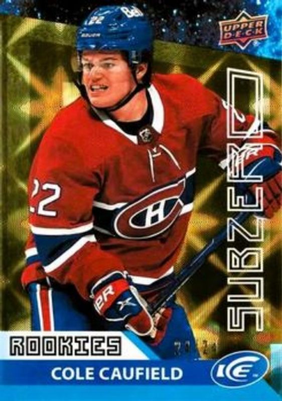 The Cole Caufield 2021 Upper Deck Ice #SZ-59 Sub Zero - Gold /8 Rookie card is 1 of 49 Cole Caufield's card variations in the 2021 Upper Deck Ice set being tracked by Sports Card Investor, including #249 Base /999, #122 Base /999, #122 Ice Blue, #122 Jersey, and #122 Lavender.