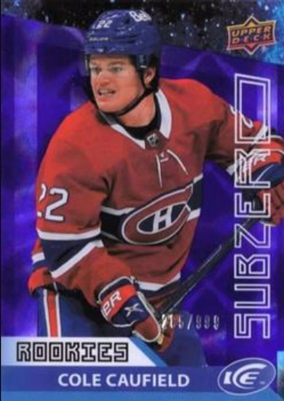 The Cole Caufield 2021 Upper Deck Ice #SZ-59 Sub Zero /999 Rookie card is 1 of 49 Cole Caufield's card variations in the 2021 Upper Deck Ice set being tracked by Sports Card Investor, including #249 Base /999, #122 Base /999, #122 Ice Blue, #122 Jersey, and #122 Lavender.