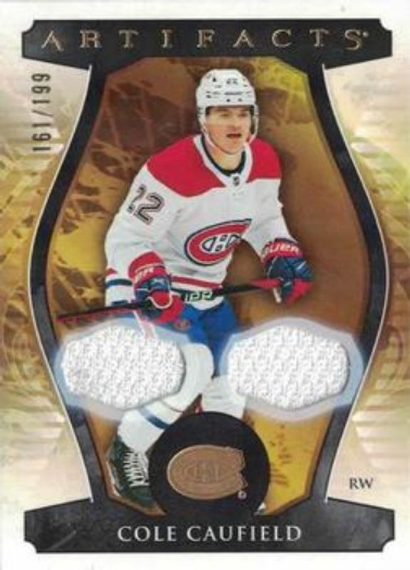 The Cole Caufield 2023 Upper Deck Artifacts #133 Material - Gold /199 card is 1 of 32 Cole Caufield's card variations in the 2023 Upper Deck Artifacts set being tracked by Sports Card Investor, including Base /999, Leather, Plexi, Turquoise, and Wood.