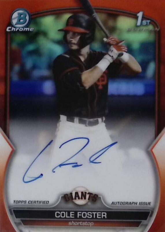 Auctions Ending Soon for Cole Foster 2023 Bowman Draft #CDA-CF Chrome DP Auto - Orange Refractor /25 (1st) RAW